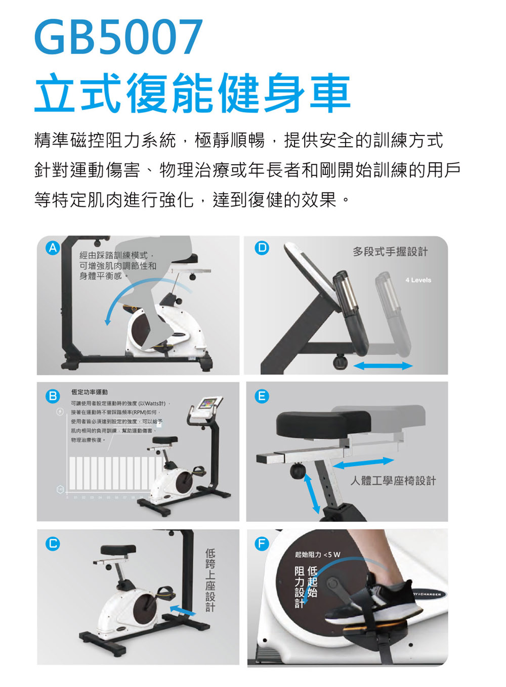 【i-Care】立式健身車 GB5007,具有精準磁控阻力系統、極靜順暢,提供安全的訓練方式!針對運動傷害、物理治療、或年長者和剛開始訓練的用戶,針對特定肌肉進行強化,達到復健的效果。