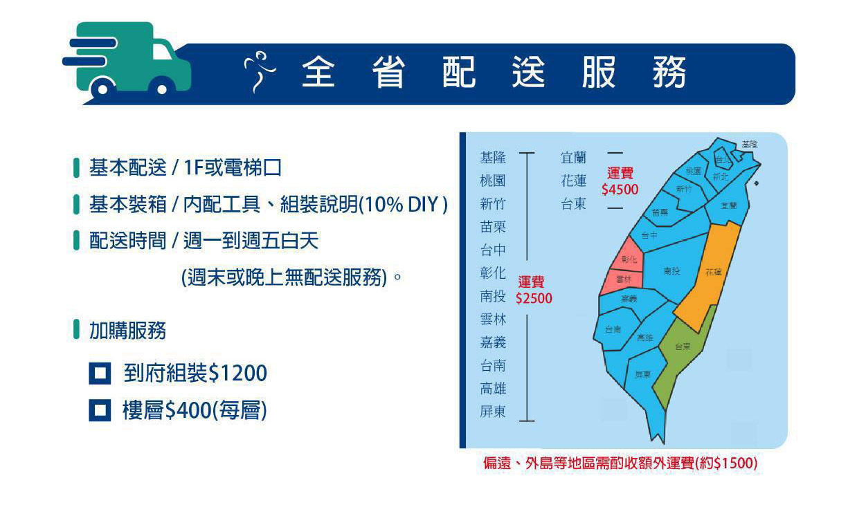 1. 此商品由於體積較大,因此安排專車配送,各地區運費請參考上圖標示,配送時請直接支付給配送人員。