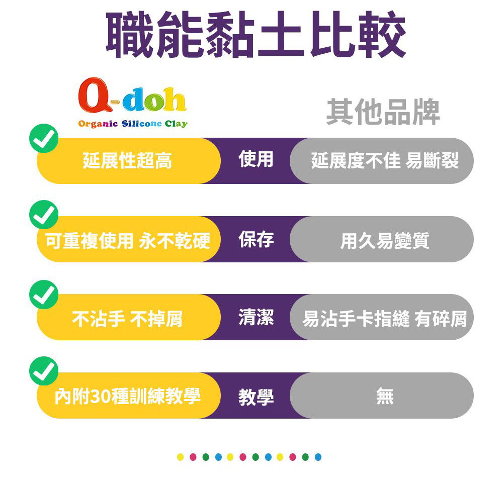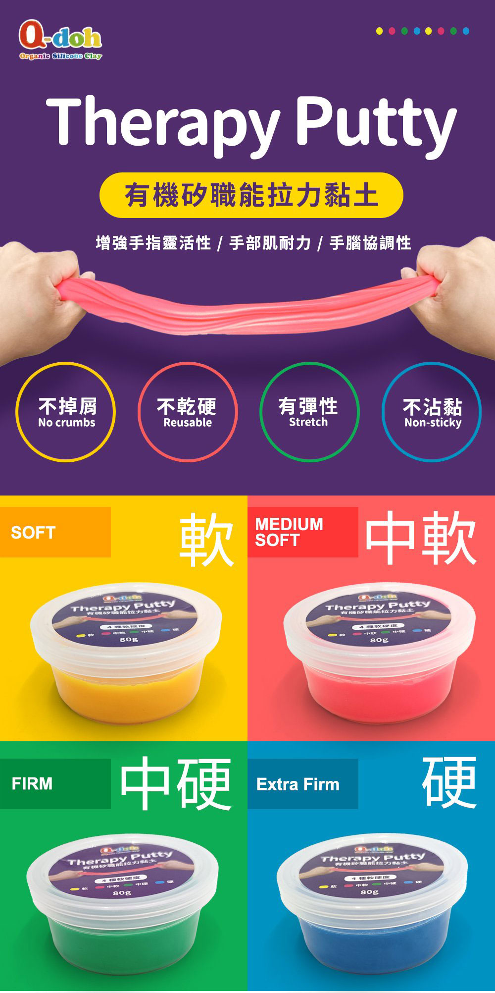 Q-doh有機矽膠職能運動黏土可分為四種顏色,每個顏色軟硬度及延展性不同(質地越硬,延展性越不佳),材質安全且獨特阻力感,可藉由不同程度的阻力活動,漸進式地訓練感覺統合、手部受傷復健、手指靈活及增進手部肌耐力...等。職能運動黏土適用於3歲以上兒童、成人與長者。