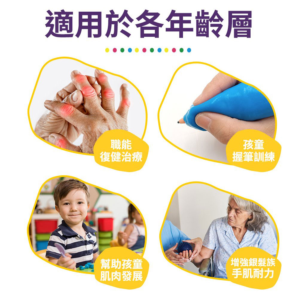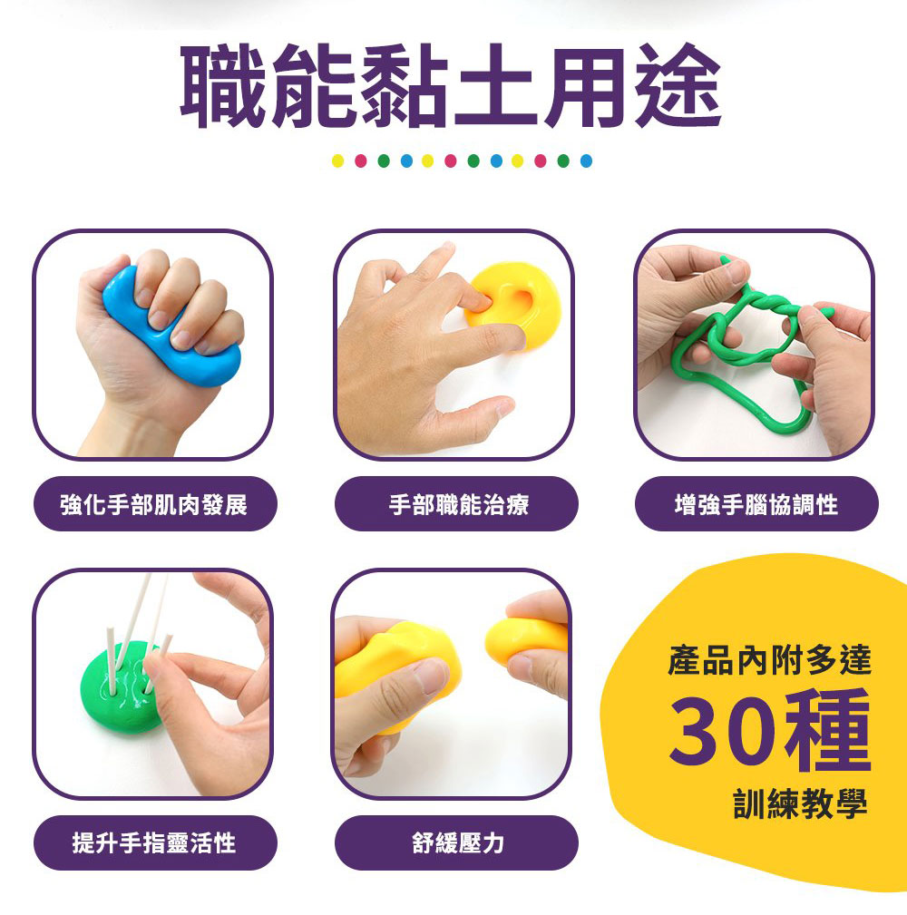 2. 內容物:有機矽職能拉力黏土 共4色 ×各80g、附贈職能運動黏土活動教案 ×1張