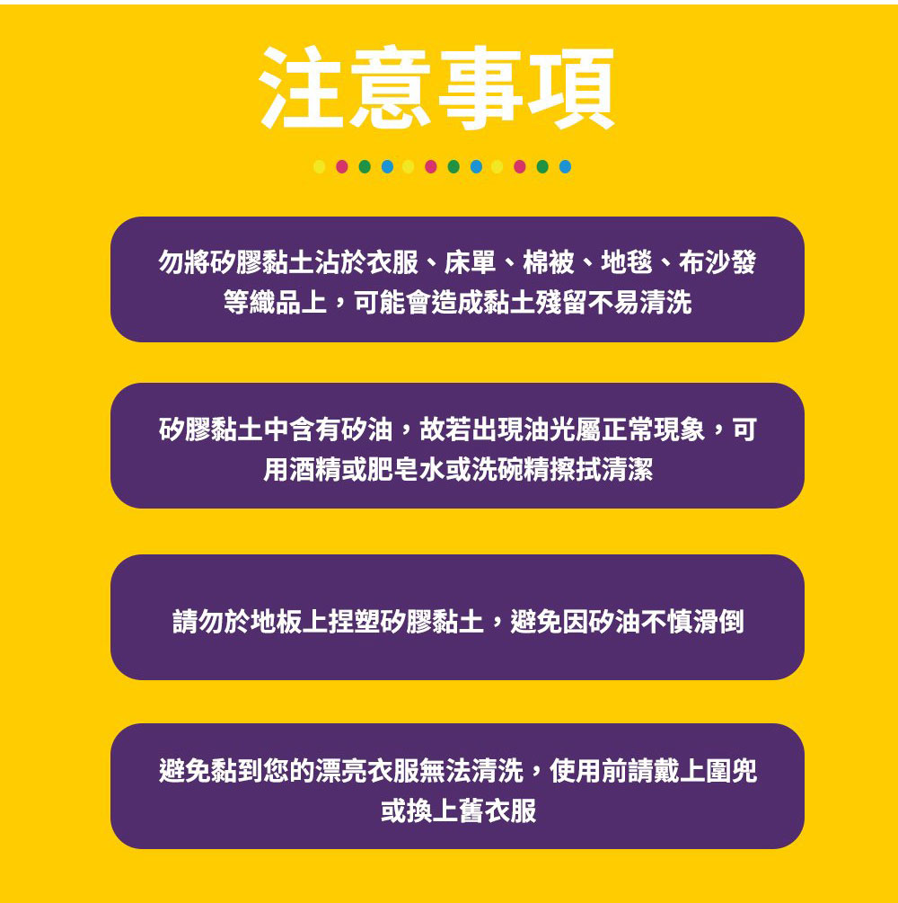 1. 勿將矽膠黏土沾於衣服、床單、棉被、地毯、布沙發...等織品上,可能會造成黏土殘留不易清洗