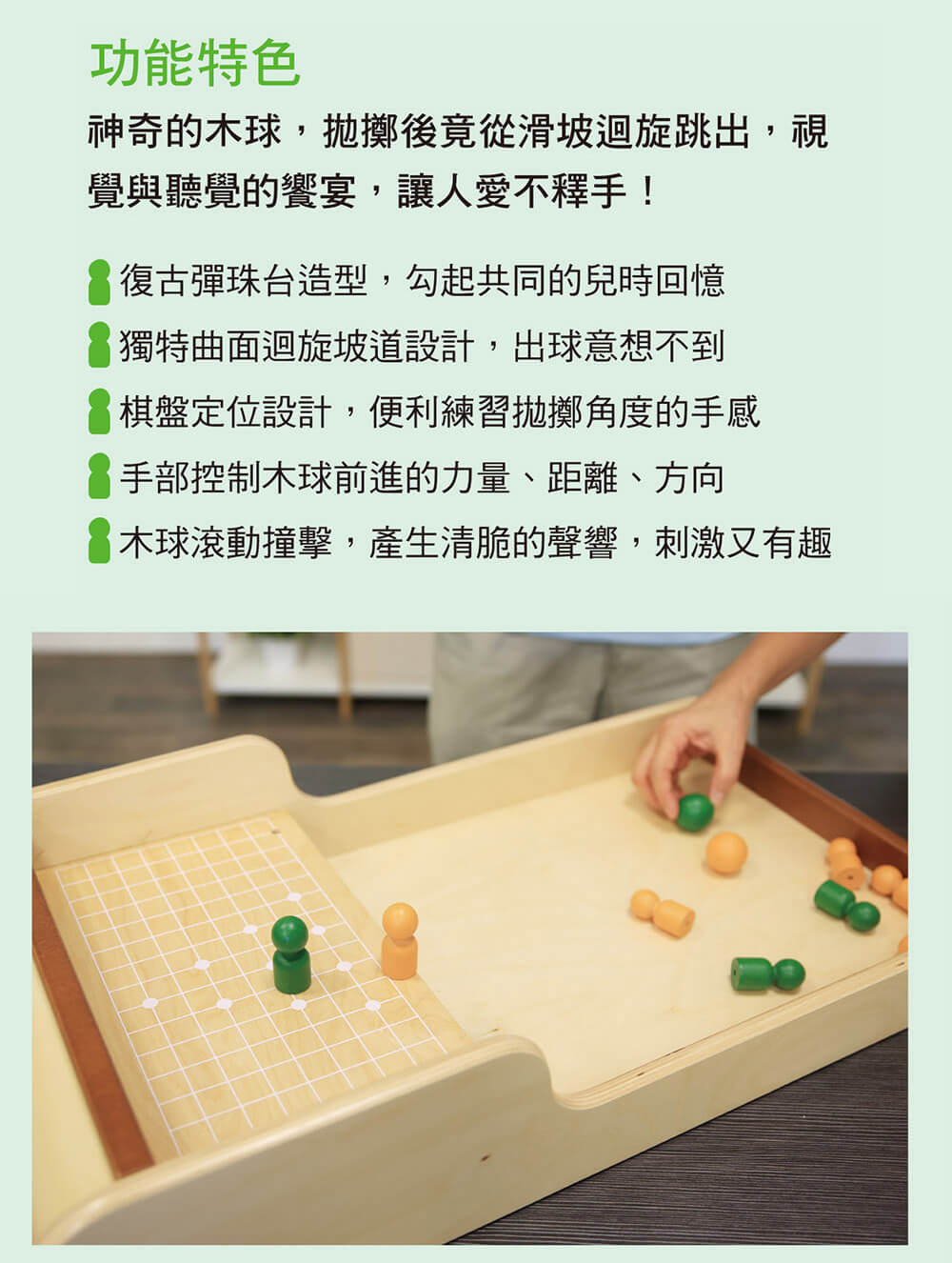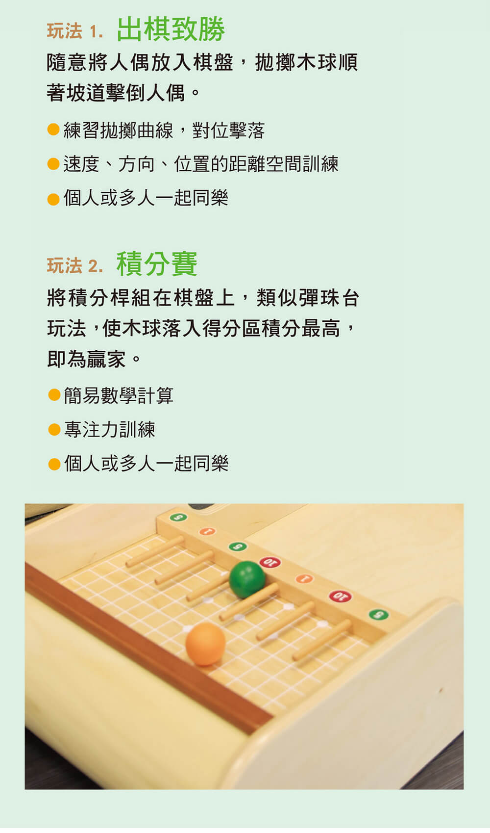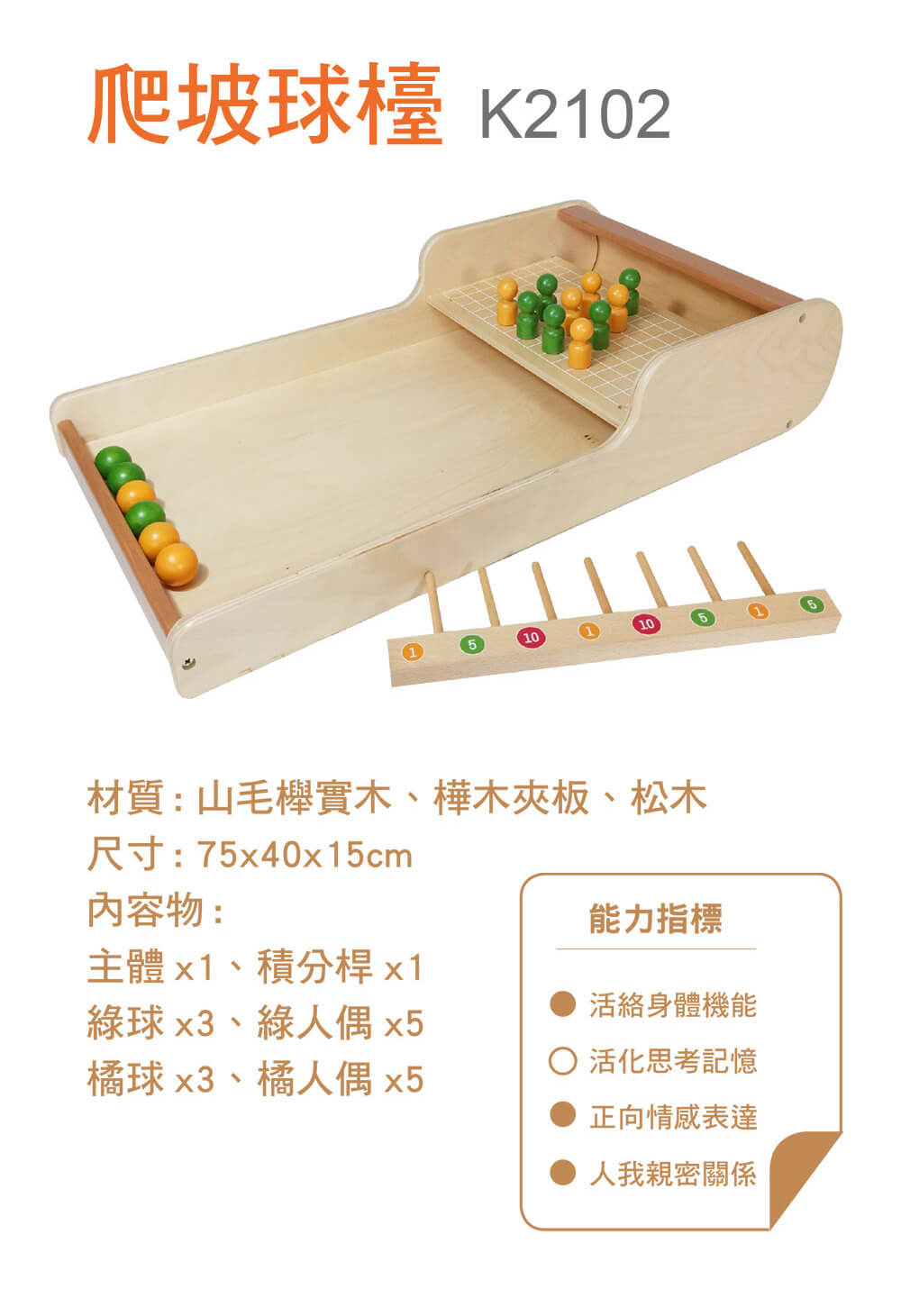 3. 內容物:主體 ×1、積分桿 ×1、綠球 ×3、綠人偶 ×5、橘球 ×3、橘人偶 ×5