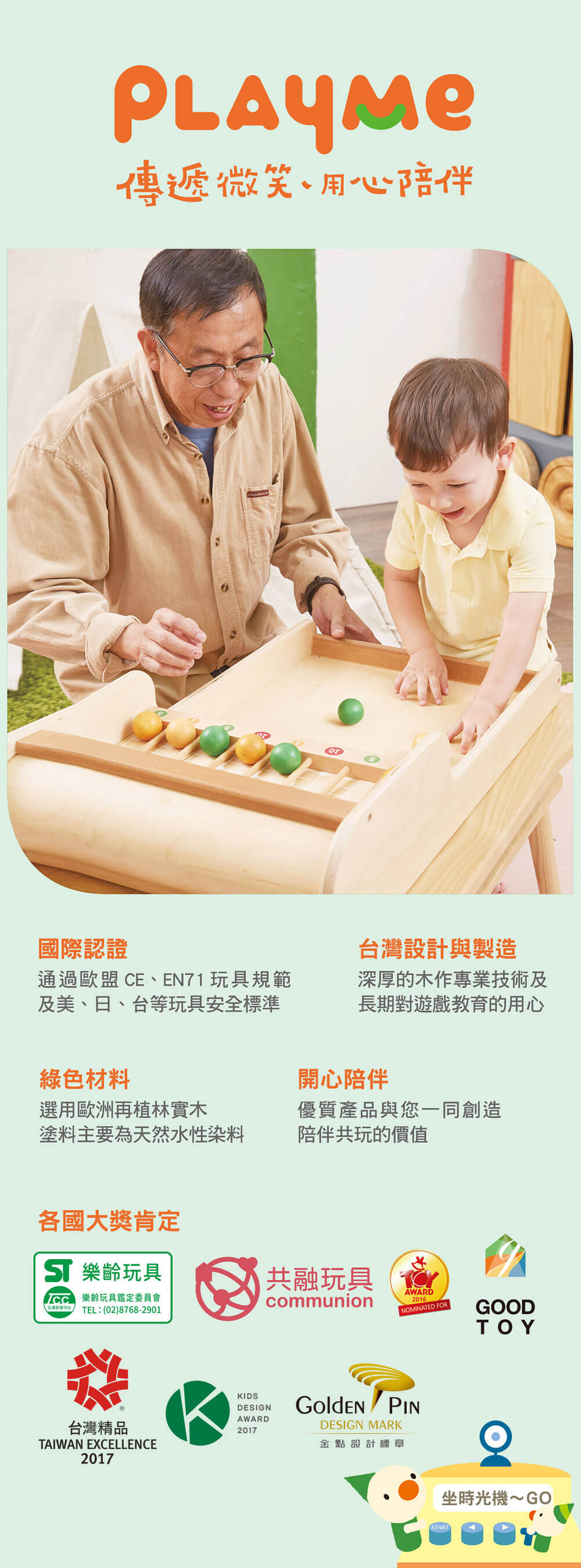 銀髮族隨著年齡增長,需要多動動手、動動腦,手腦眼並用,讓老化的大腦重新煥發活力!【playme】系列玩具藉由深厚的木作專業技術及長期對遊戲教育的用心,開發優質產品創造陪伴共玩的價值,遊戲通過歐盟CE、EN71玩具規範及美、日、台等玩具安全標準,幫助長輩在安全的遊戲過程中,達到活絡身體機能、活化記憶力等有效訓練。
