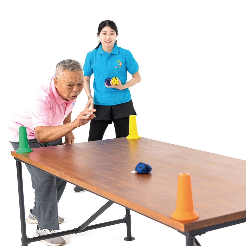 •拿起瓢蟲豆袋推向目標,擊中軟式標誌桶,無論站著或坐著,我們一起同享競賽的樂趣。