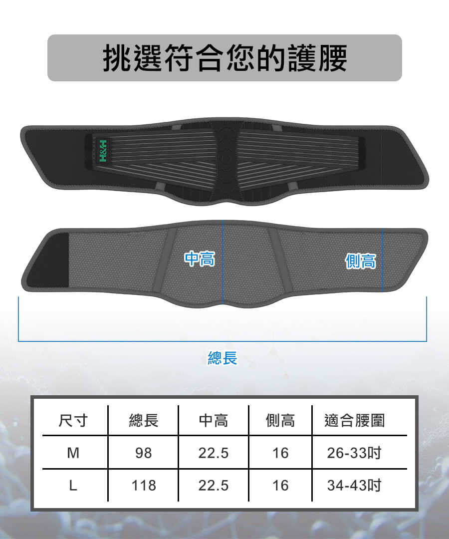 • M 98 ×22.5 ×0.5 cm ±5% (適用腰圍 26-33吋)