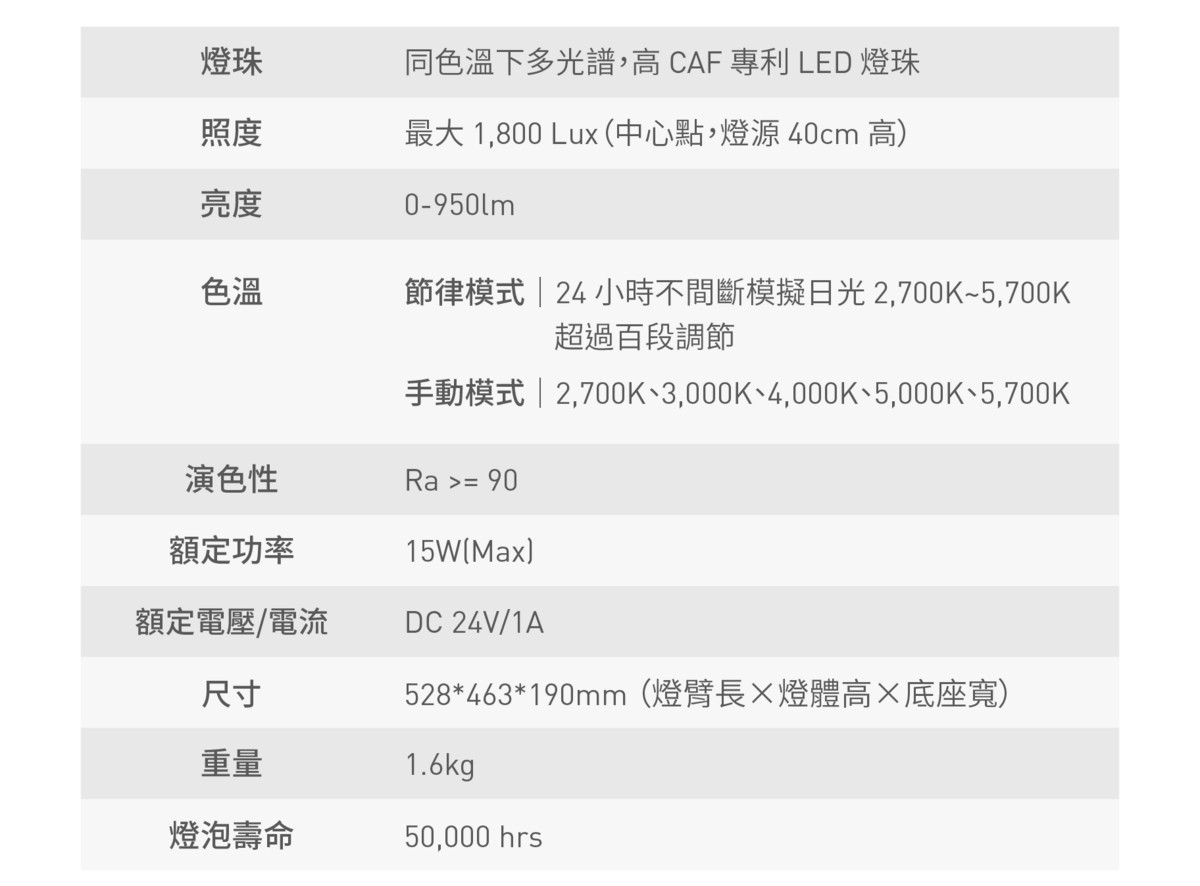 6. 照度:最大 1,800Lux (中心點,燈源 40cm高)