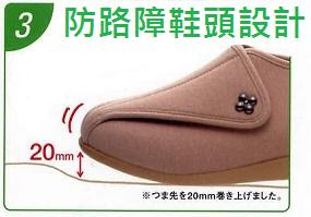 4. 鞋頭約有20mm的微翹設計,減少長輩因踢到障礙物而跌倒的機會。