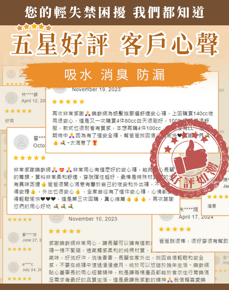 1. 針對有輕微失禁的婦女所設計,可吸水100cc,讓有失禁困擾的婦女出門時更安心,不用隨時擔心弄濕外褲或要經常上廁所 。