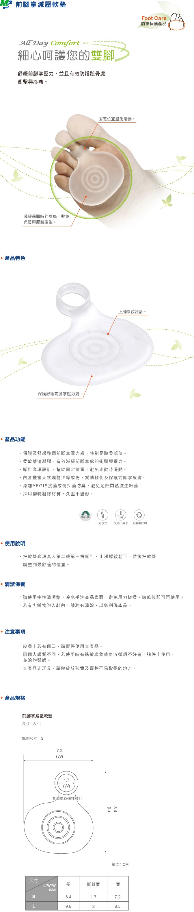 保護舒緩前腳掌壓力處,特別是蹠骨部位。舒適套環設計,幫助固定位置,避免走動時滑動。採用獨特凝膠材質,內含豐富天然礦物油等成份,幫助軟化硬繭粗皮,並特別添加AEGIS抗菌成份抑菌防臭,避免足部悶熱滋生細菌。