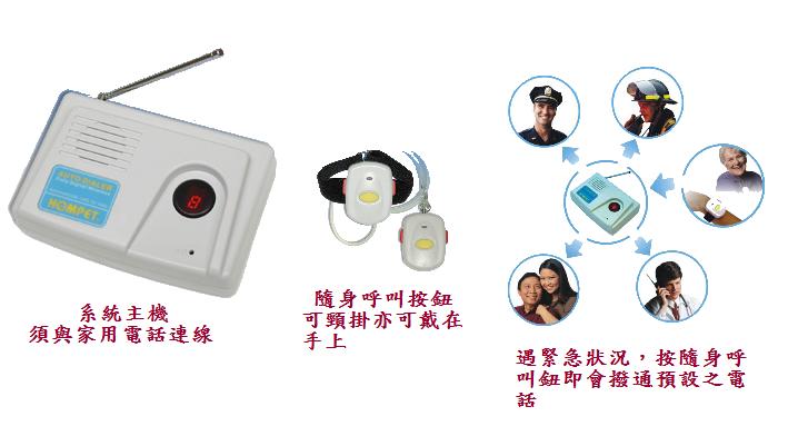 與一般家用電話機連接(不適用網路電話、總機系統、交換機系統),即可設定對外求援的電話號碼及錄製求援語音訊息。 |