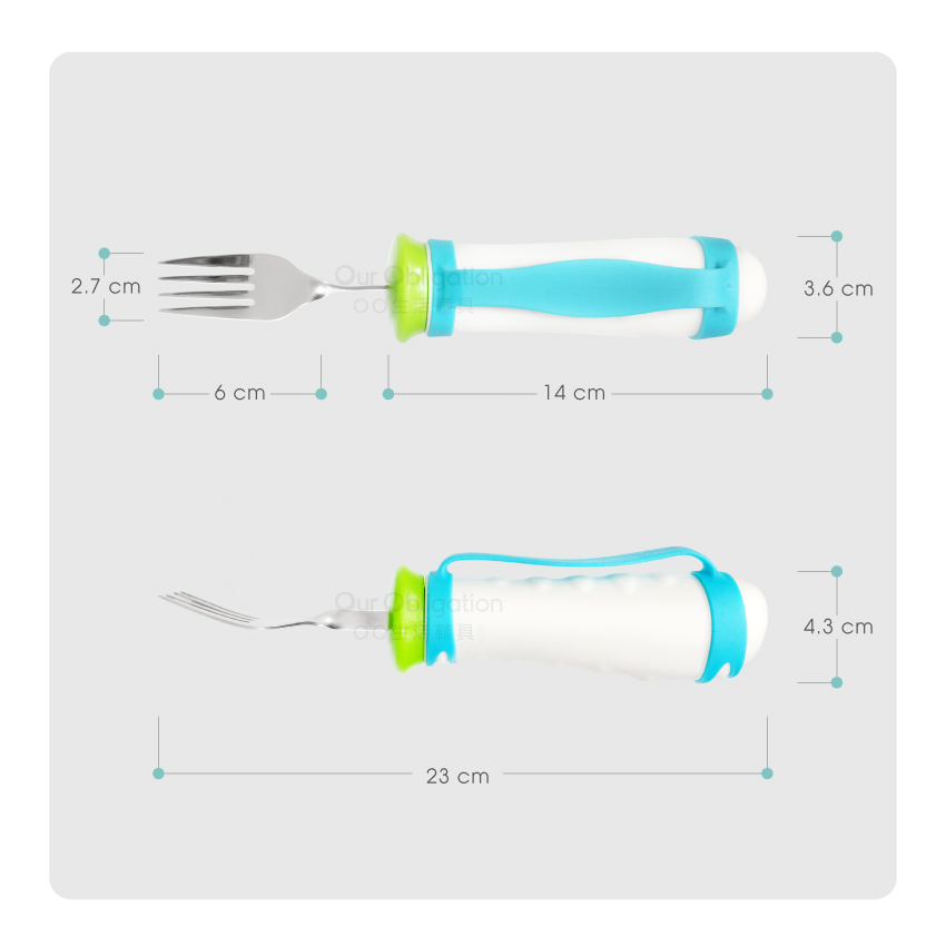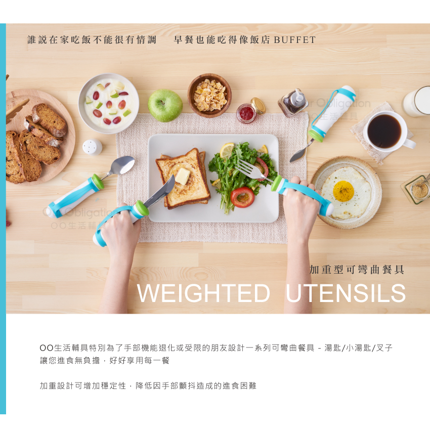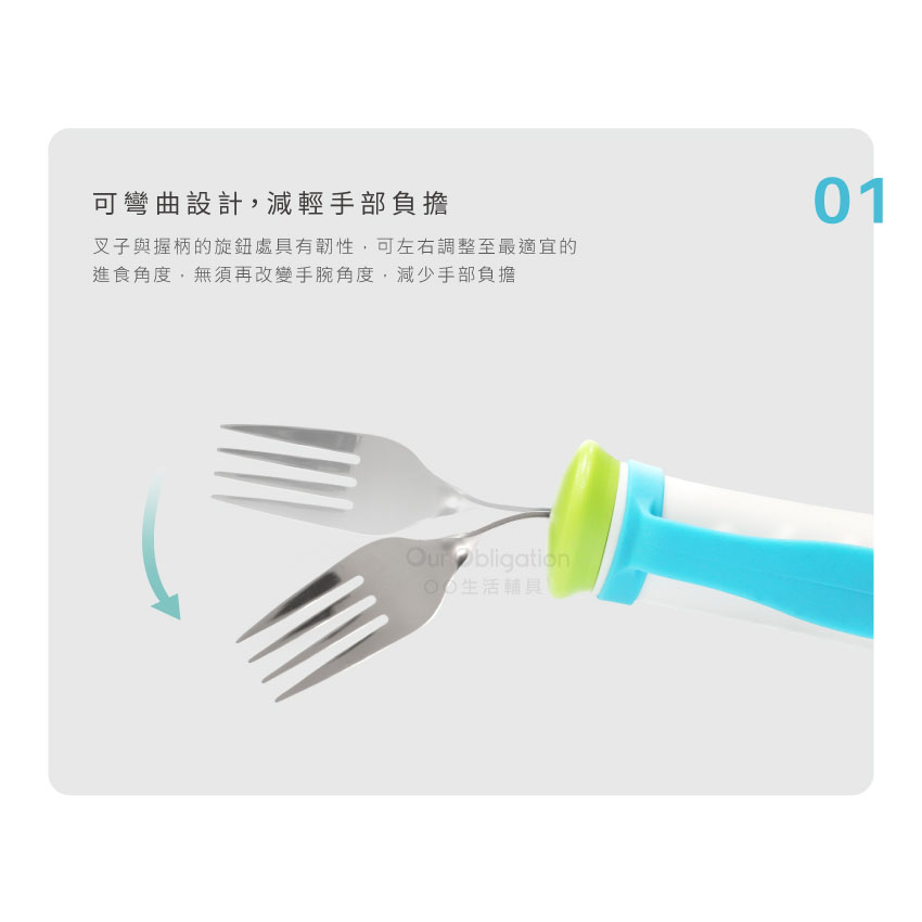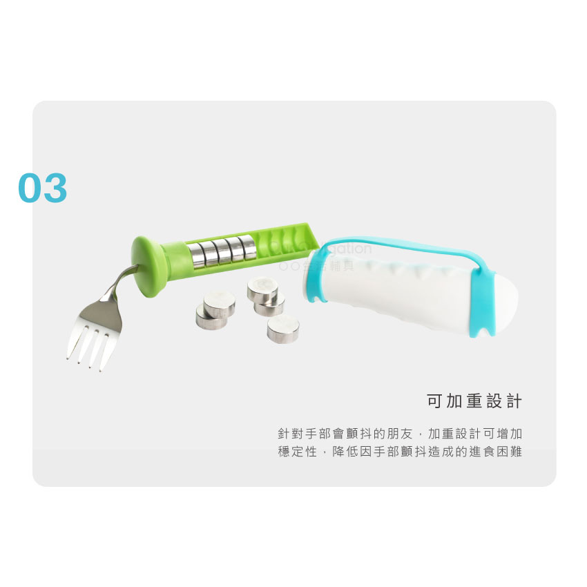 【加重型可彎曲叉子】,可填充砝碼加重,增加使用時的穩定性,可任意彎折設計,能調整至個人最合適的角度,減輕手腕負擔,握柄材質止滑、加粗,輕鬆抓握且舒適,讓餐具可以輕易配合長者的進食習慣,重新找回自信與尊嚴。
