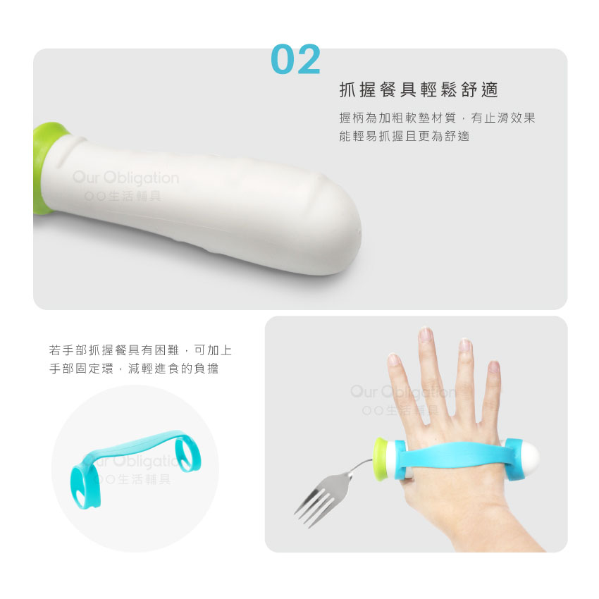 2. ● 加粗柔軟握柄,舒適好握‧貼心環扣帶,進食超輕鬆