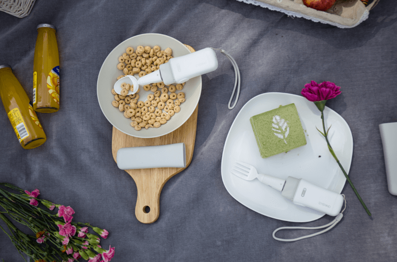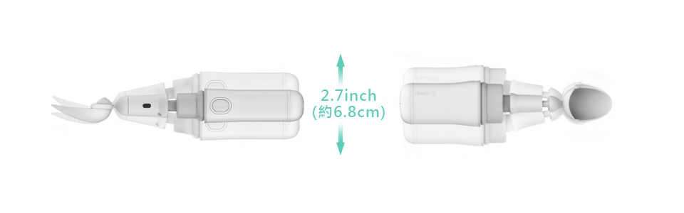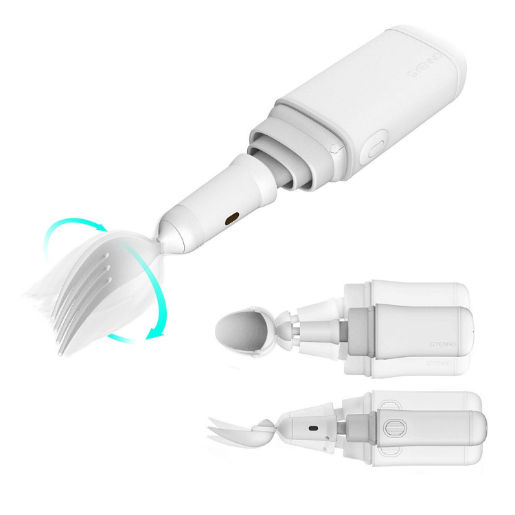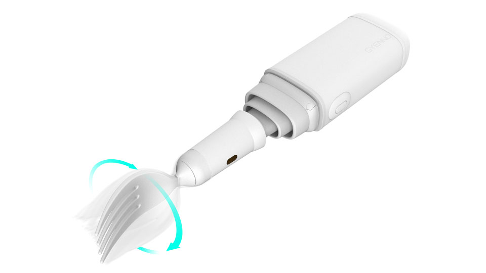 提供湯匙、叉子兩種磁吸餐頭,可依需求拆卸更換使用;加入360° 自動旋轉模式,幫助捲起麵條類食物,更加方便。並附有防塵套,方便攜帶,隨處都能自在用餐。