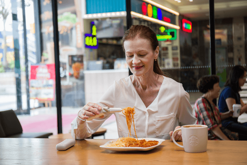 對於帕金森氏症、中風等引起手部抖動的人來說,要自己好好吃一頓飯是非常困難的。因為手不停地顫抖,用一般餐具舀起食物很容易灑落,造成用餐不方便,甚至需要他人協助餵食,不僅感到尷尬、自卑,久而久之對整個生活都會失去信心。