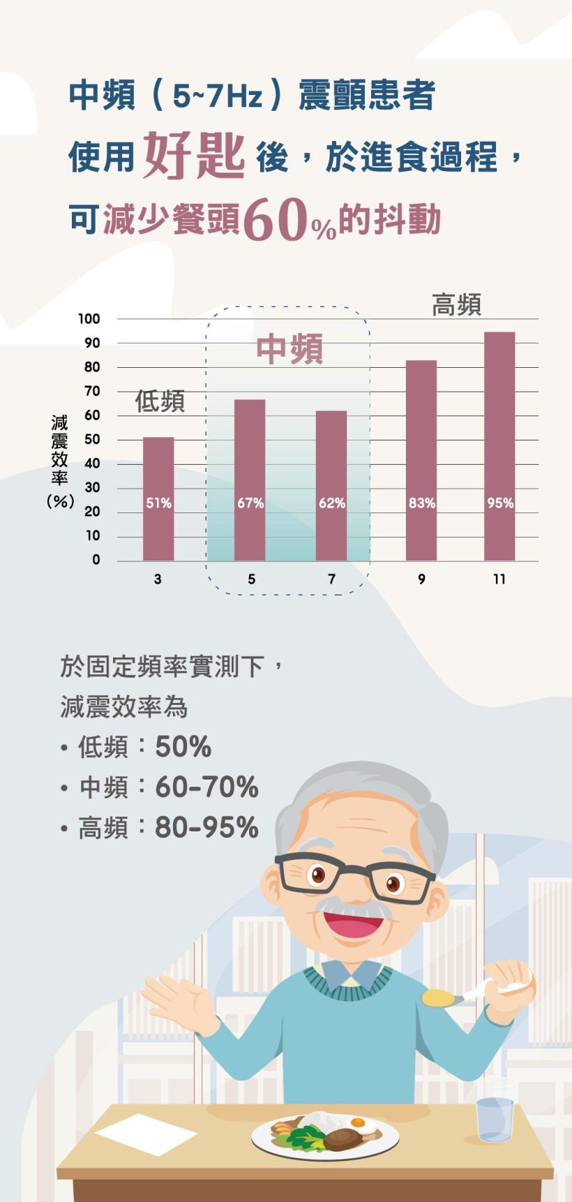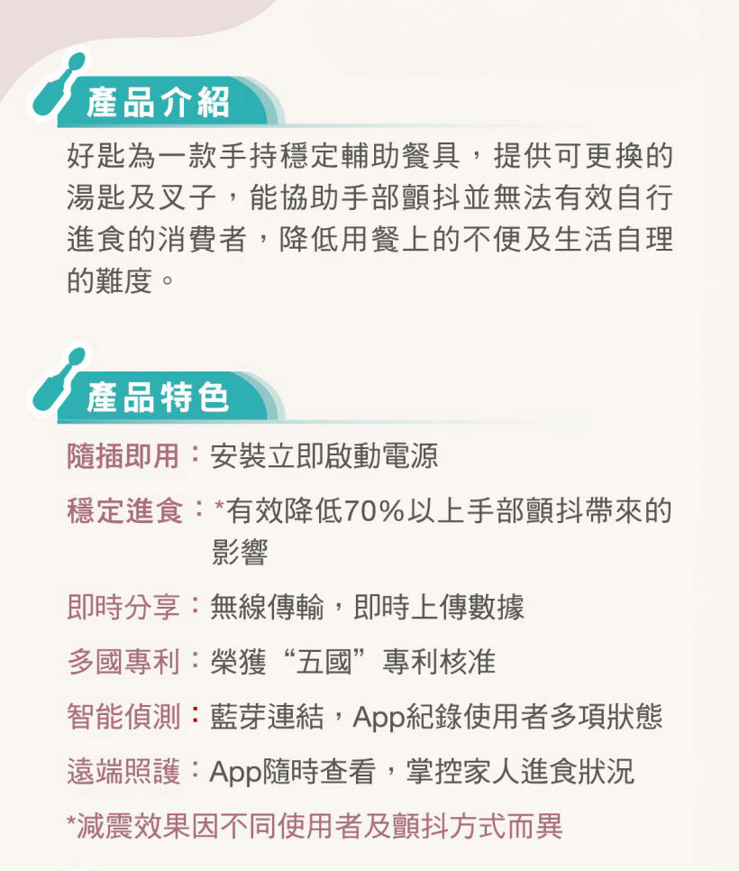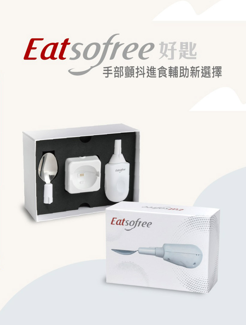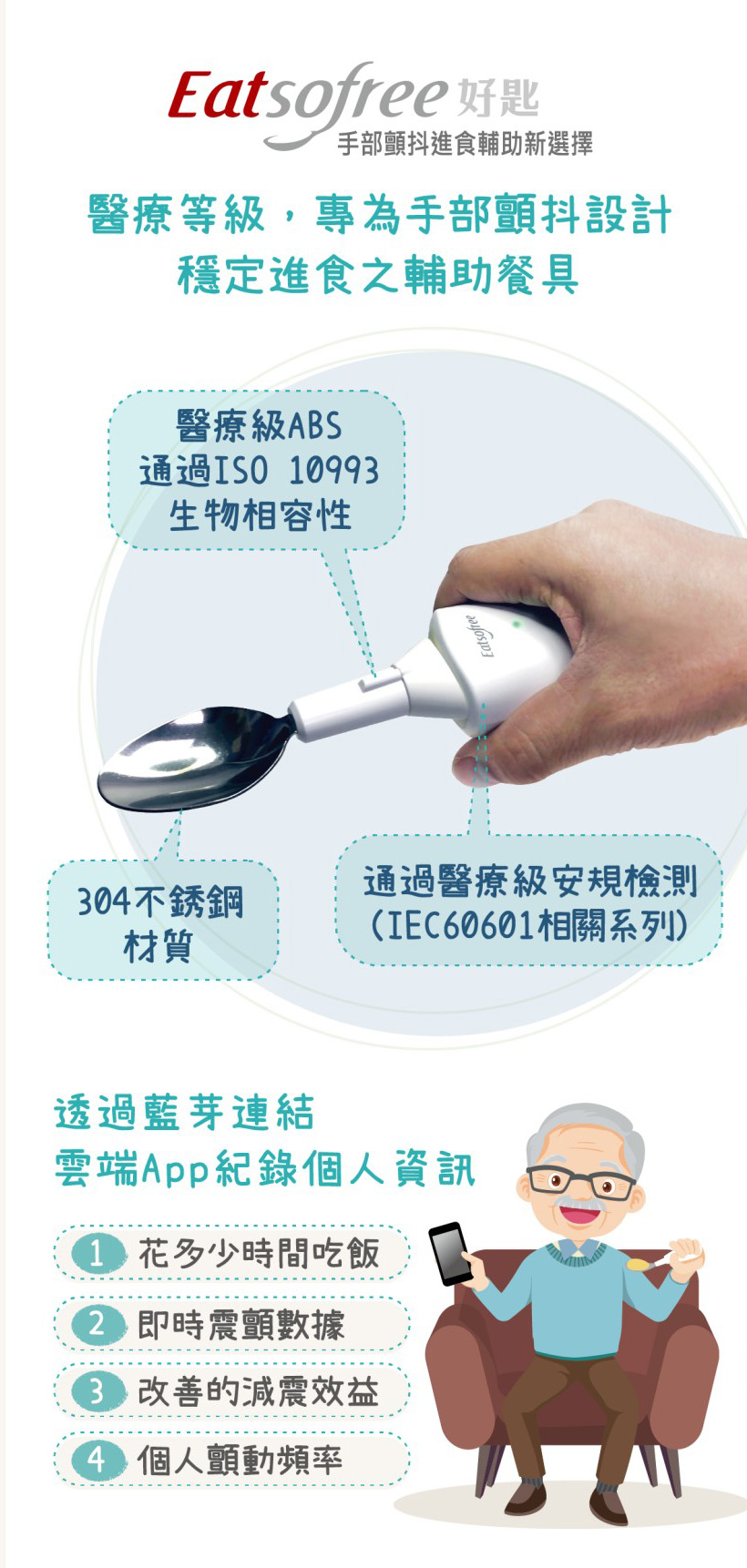 【Eatsofree】好匙,手部顫抖進食輔助的新選擇!有效降低70%以上手部顫抖帶來的影響,透過藍芽連結雲端APP紀錄個人資訊,包含花多少時間吃飯、 即時震顫數據、改善的減震效益、個人顫動頻等等,幫助手部顫抖並無法有效自行進食者,降低用餐上的不便,達到生活自理!