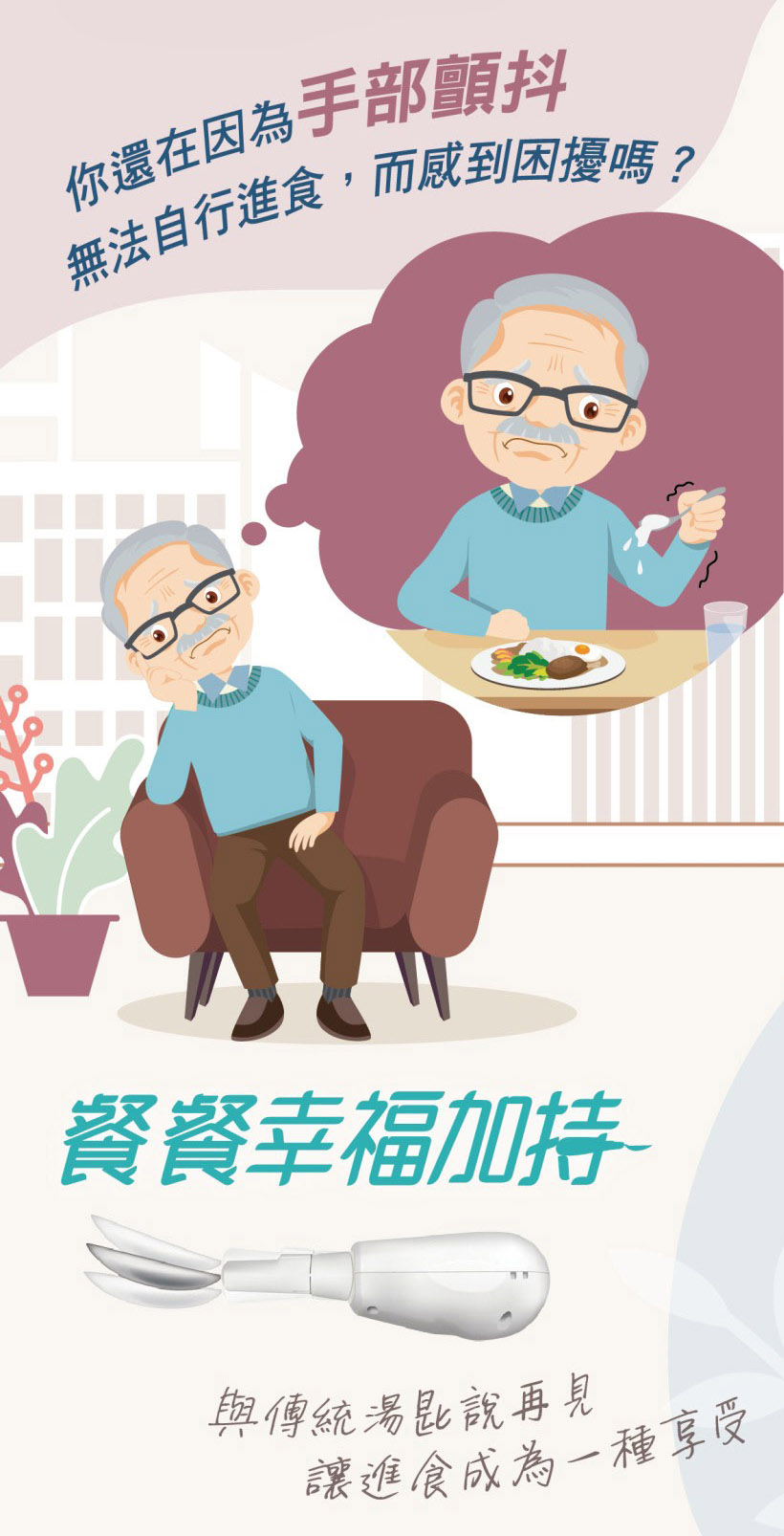 對於帕金森氏症、中風等引起手部抖動的人來說,要自己好好吃一頓飯是非常困難的。因為手不停地顫抖,用一般餐具舀起食物很容易灑落,造成用餐不方便, 甚至需要他人協助餵食,不僅感到尷尬、自卑,久而久之對整個生活都會失去信心。
