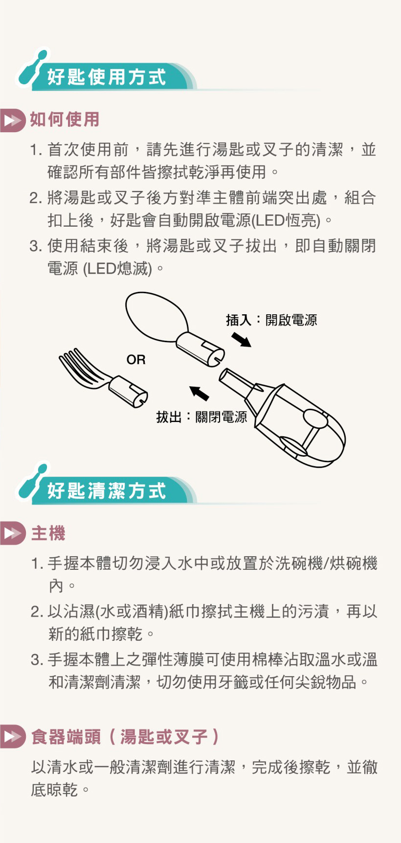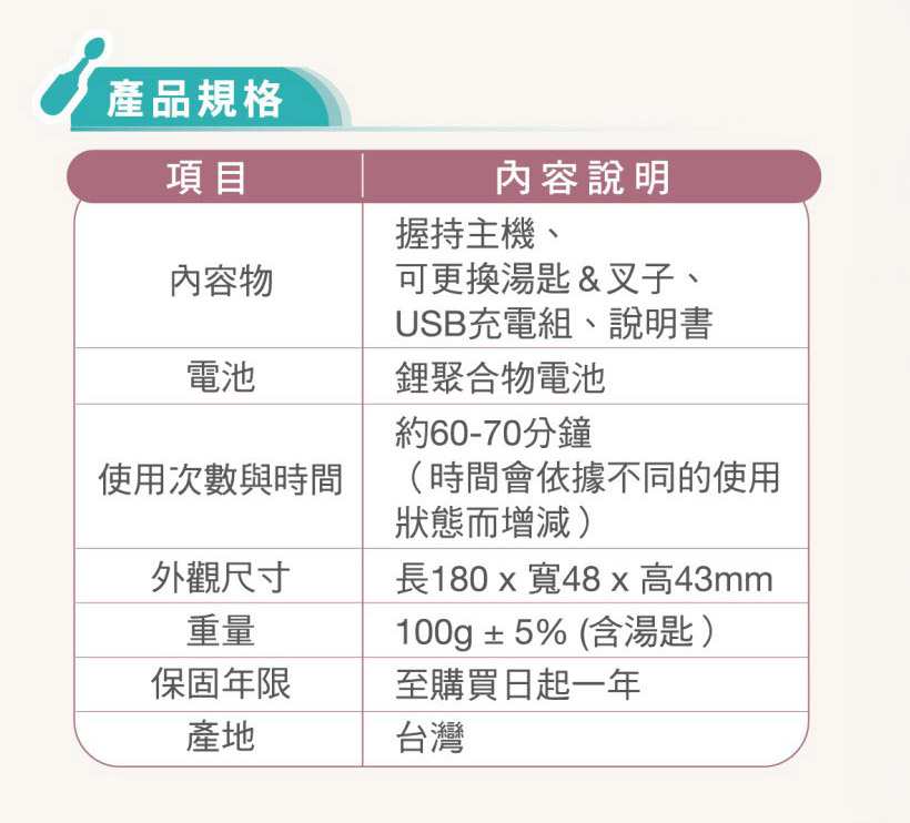 3. 內容物:握持主機、可更換湯匙&叉子、USB充電組(充電底座、5B/1A USB充電插頭、Micro USB充電線)、手掛繩、束口袋、說明書