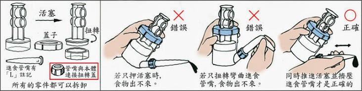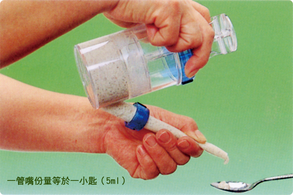 2. 用推進活塞並擠壓進食管嘴餵食柔軟細塊、流質食物,方便使用省時省力,一管嘴等於一小匙(5ml)。