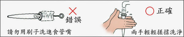 2. 請勿用刷子洗進食管嘴,正確方法為兩手輕輕搓揉洗淨即可。