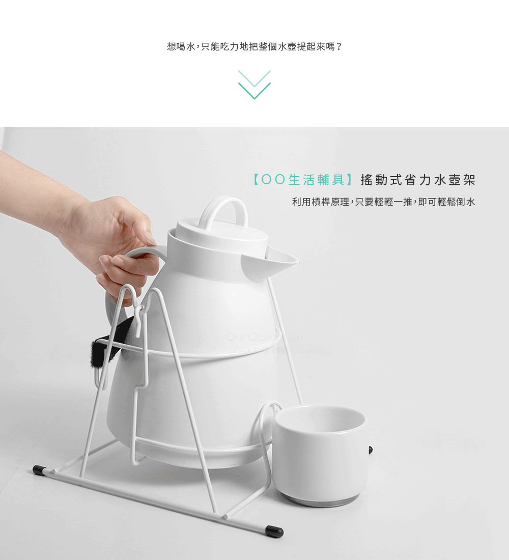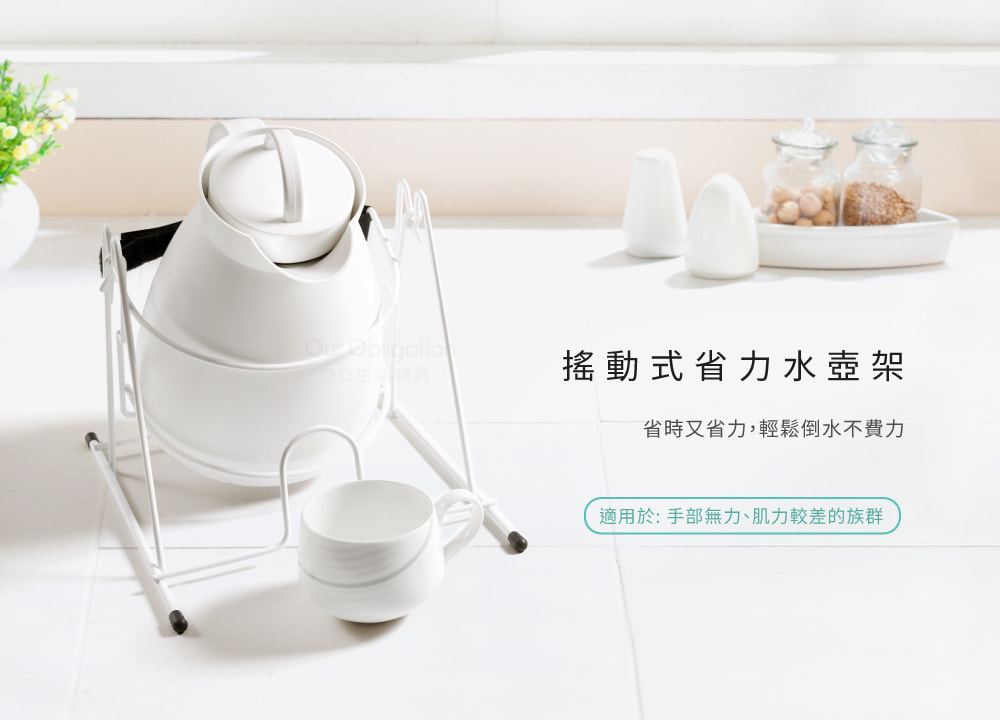 推薦【OO生活輔具】搖動式省力水壺架,利用槓桿原理,只要輕輕一推,即可輕鬆倒水。