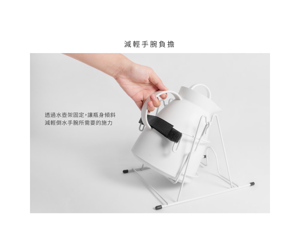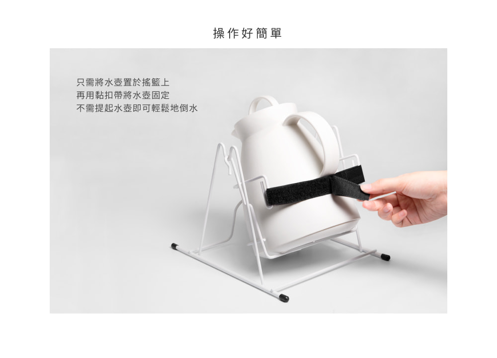 操作簡易,只需將水壺置於搖籃上,再用黏扣帶將水壺固定,不需提起水壺即可輕鬆地倒水。減輕倒水時手腕需要的施力,讓動作符合人體工學更輕鬆,省力又享受,喝水就是這麼簡單!