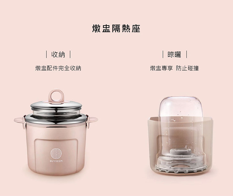• 燉盅套組 燉盅支架外蓋、燉盅內蓋(含隔熱矽膠圈)、燉盅、燉盅支架、燉盅隔熱座
