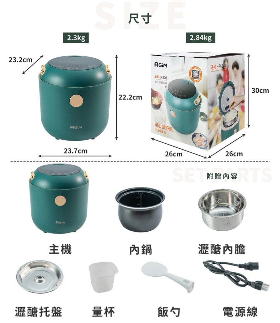 3. 內容物:機身主機、內鍋、瀝醣內膽、瀝醣托盤、量杯、飯勺、電源線、說明書(保固卡)