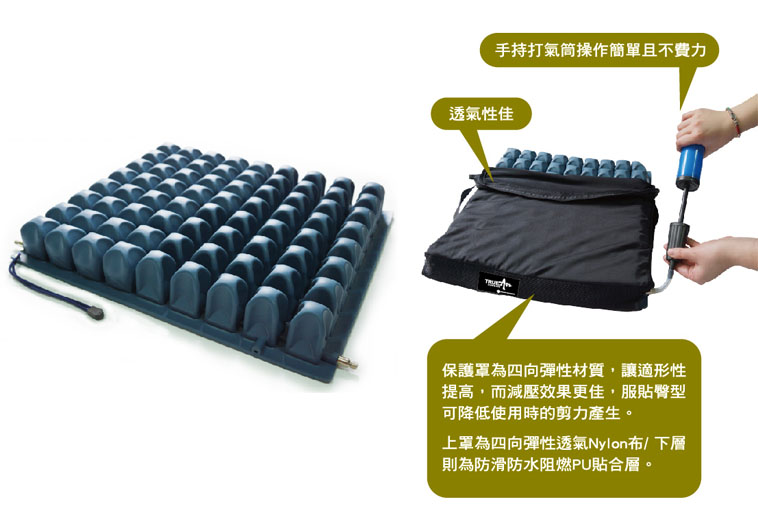 1. 氣囊數量為64顆(16吋款)及72顆(18吋款),顆數多而密集,讓接觸面積增加,使壓力分散及減壓能力大為提升,舒適穩定程度明顯卓越。