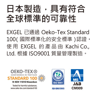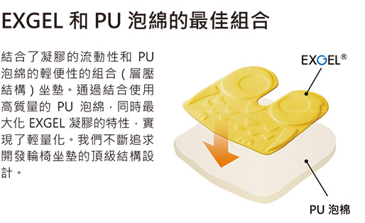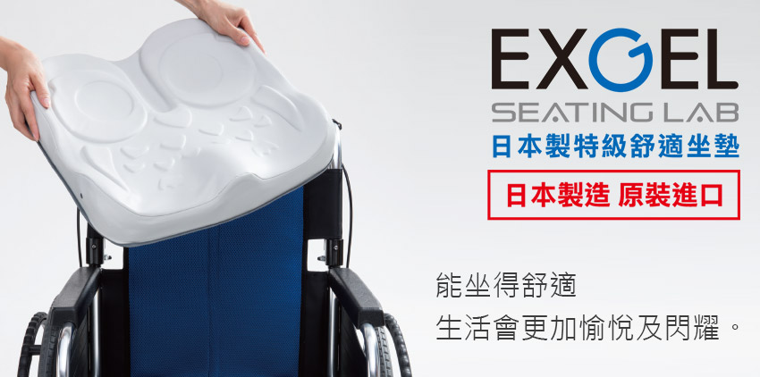 - EXGEL輪椅用坐墊在日本已有20 多年的歷史,對其身體壓力分散效果和預防褥瘡的效果已得到高度評價。是日本EXGEL SEATING LAB 與日本復健專家共同合作開發,將可分散身體壓力及適合活動的材料與能保持良好姿勢的形狀設計相結合,並根據不同的使用狀況開發不同的坐墊供選擇。(輪椅使用者只要能坐得舒服,也能使用其他系列坐墊。)