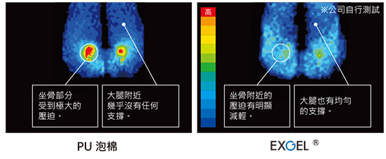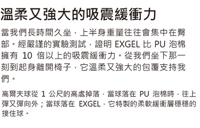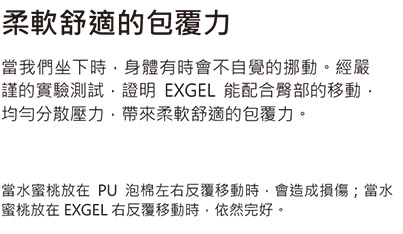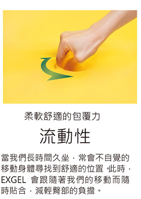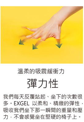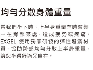 柔軟舒適的包覆力,就能減輕長時間坐著的身體負擔,EXGEL實踐了以上優點,帶來前所未有的舒適體驗。