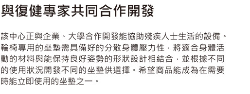 對於些坐在輪椅上生活的人,能夠舒適地坐著,就能心情愉快的度過每一天,但是如果坐著的時間是不舒服的,生活也會覺得很痛苦。