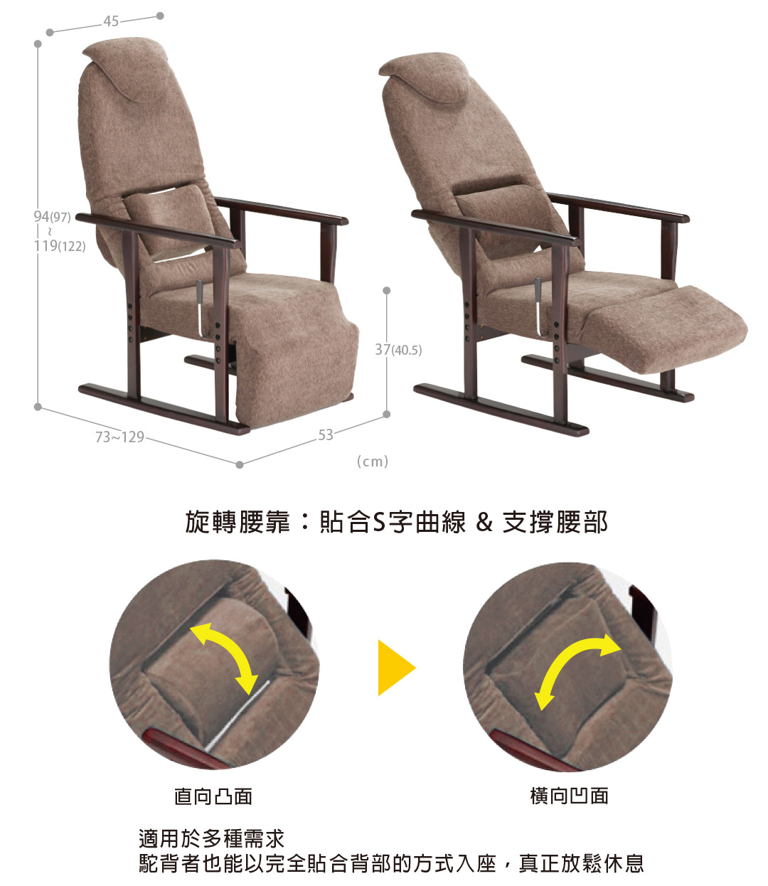 推薦日本【FranceBed】後躺休息椅 SEC-02,椅背最多可後躺至45度,頭靠、腿靠角度可調,腰部旋轉即可選擇凹面貼合或凸面支撐,駝背者也能舒適入座,是居家放鬆休息的好選擇!