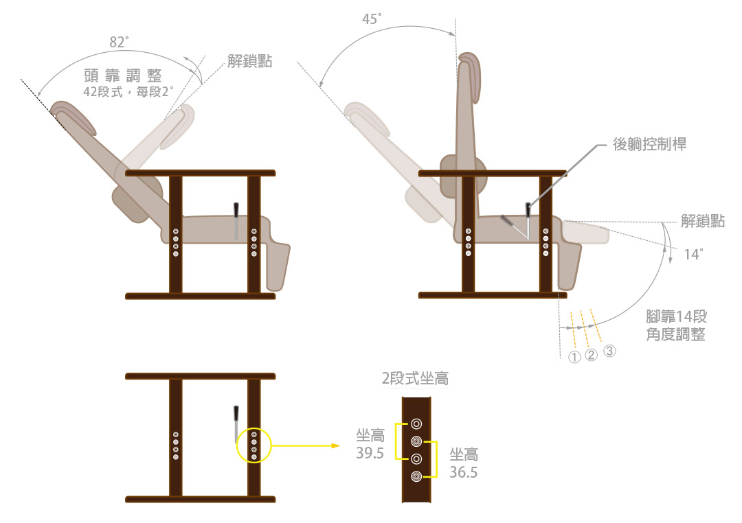 8. 椅背調整:側邊控制桿操作,最多後躺45°