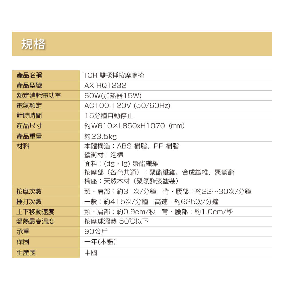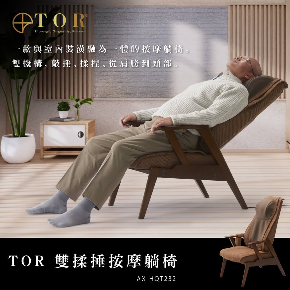 擔心銀髮長輩長時間坐著,容易感到腰酸背痛嗎?是否為他們的肌肉僵硬和不適而煩惱?【ATEX】TOR 雙揉捶按摩躺椅 (深棕) 232DB,正是理想的選擇方案!讓長輩在家中也能享受到專業的按摩服務,提升他們的生活質量。選擇【ATEX】TOR 雙揉捶按摩躺椅 (深棕) 232DB,是您關愛家人健康的最佳選擇。