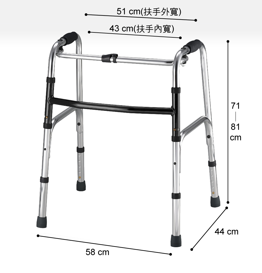 6. 調整高度:71 ~ 81cm (不包含【一吋助型器輪管+三吋輪】、【下壓式彈簧剎車套管】)