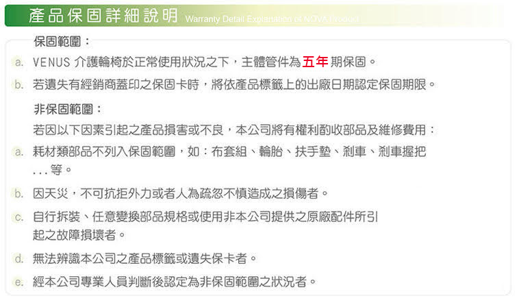 4. 保固年限:五年 (僅限主體,輪子等耗材及人為因素造成之損壞不在保固範疇內)
