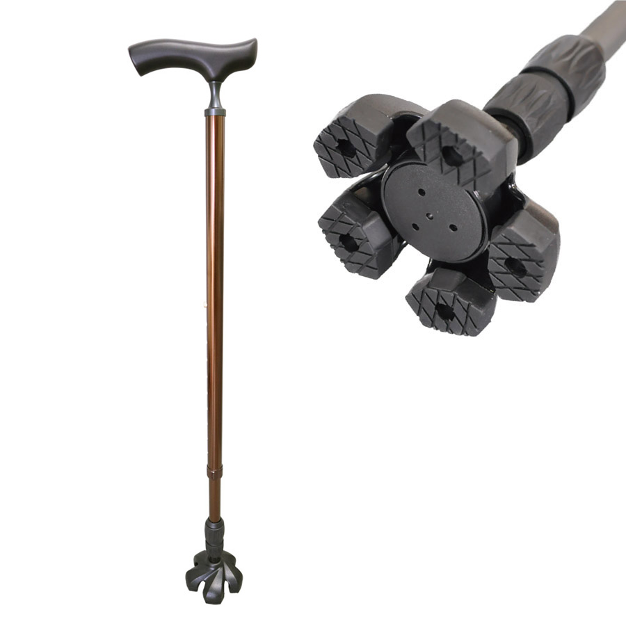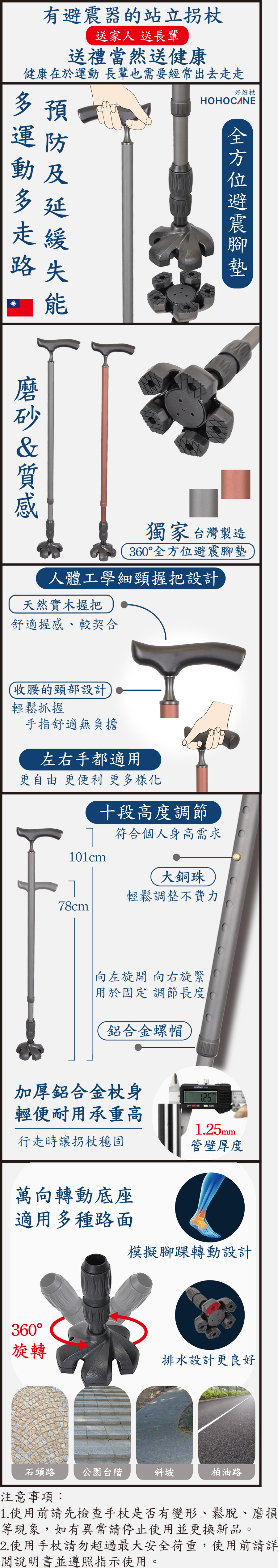 模擬腳踝活動設計,使著地的五腳始終保持緊貼地面,360度可轉動的避震器腳墊,有著大面積底座,提供長者行走在柏油路、斜坡、台階、石頭路等路面行走施力更穩定,全方位避震底座設計讓拐杖落地時手感舒適,手杖隨時隨地可以站立不傾倒,用餐、休息、購物沒煩惱,使用具備舒適與便利性,是協助老人行進時的輔助工具。