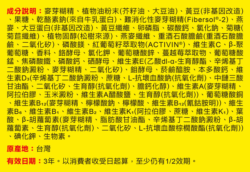 1. 本產品含有牛奶類、大豆、含有麩質的穀類及其製品。