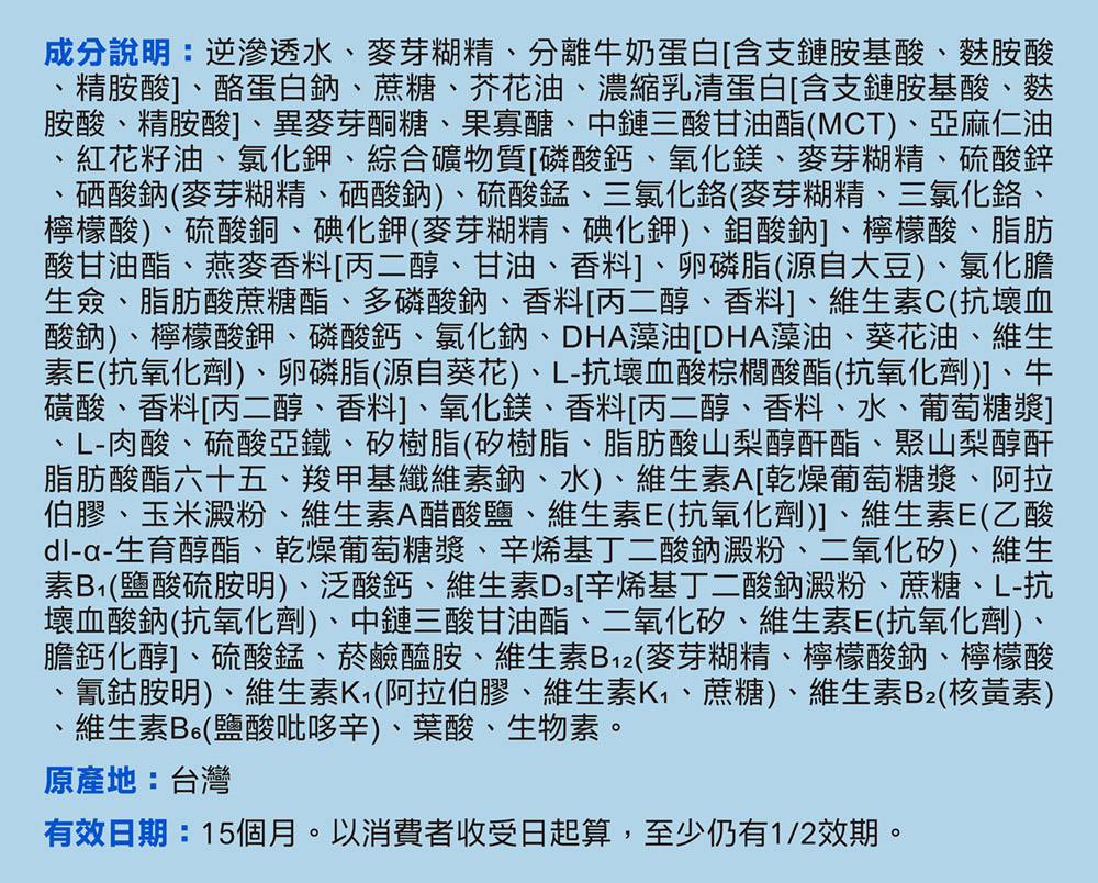 6. 成分說明:逆滲透水、麥芽糊精、分離牛奶蛋白[含支鏈胺基酸、麩胺酸、精胺酸]、酪蛋白鈉、蔗糖、芥花油、濃縮乳清蛋白[含支鏈胺基酸、麩胺酸、精胺酸]、異麥芽酮糖、果寡醣、中鏈三酸甘油酯(MCT)、亞麻仁油、紅花籽油、氯化鉀、綜合礦物質[磷酸鈣、氧化鎂、麥芽糊精、硫酸鋅、硒酸鈉(麥芽糊精、硒酸鈉)、硫酸錳、三氯化鉻(麥芽糊精、三氯化鉻、檸檬酸)、硫酸銅、碘化鉀(麥芽糊精、碘化鉀)、鉬酸鈉]、檸檬酸、脂肪酸甘油酯、燕麥香料[丙二醇、甘油、香料]、卵磷脂(源自大豆)、氯化膽生僉、脂肪酸蔗糖酯、多磷酸鈉、香料[丙二醇、香料]、維生素C(抗壞血酸鈉)、檸檬酸鉀、磷酸鈣、氯化鈉、DHA藻油[DHA藻油、葵花油、維生素E(抗氧化劑)、卵磷脂(源自葵花)、L-抗壞血酸棕櫚酸酯(抗氧化劑)、牛磺酸、香料[丙二醇、香料]、氧化鎂、香料[丙二醇、香料、水、葡萄糖漿]、L-肉酸、硫酸亞鐵、矽樹脂(矽樹脂、脂肪酸山梨醇酐酯、聚山梨醇酐脂肪酸酯六十五、羧甲基纖維素鈉、水)、維生素A[乾燥葡萄糖漿、阿拉伯膠、玉米澱粉、維生素A醋酸鹽、維生素E(抗氧化劑)]、維生素E(乙酸dl-α-生育醇酯、乾燥葡萄糖漿、辛烯基丁二酸鈉澱粉、二氧化矽)、維生素B1(鹽酸硫胺明)、泛酸鈣、維生素D3[辛烯基丁二酸鈉澱粉、蔗糖、L-抗壞血酸鈉(抗氧化劑)、中鏈三酸甘油酯、二氧化矽、維生素E(抗氧化劑)、膽鈣化醇、硫酸錳、菸鹼醯胺、維生素B12(麥芽糊精、檸檬酸鈉、檸檬酸、氰鈷胺明)、維生素K1(阿伯膠、維生素K1、蔗糖)、維生素B2(核黃素)、維生素B6(鹽酸吡哆辛)、葉酸、生物素。