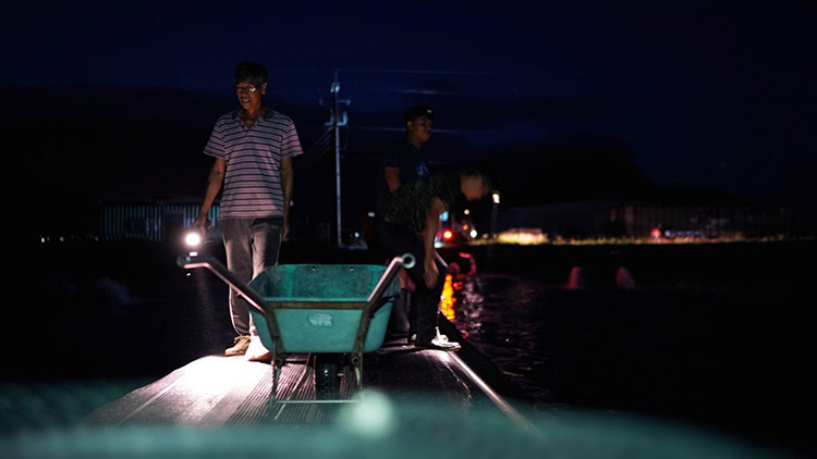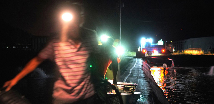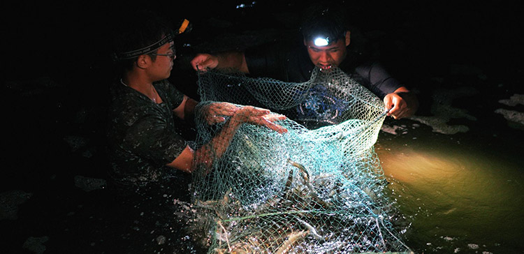 (場長的徒弟們頂著頭燈,迅速將草蝦採收上岸)
