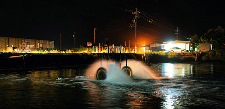 (養蝦池的水車24小時轉動,要給魚蝦充足的氧氣循環)