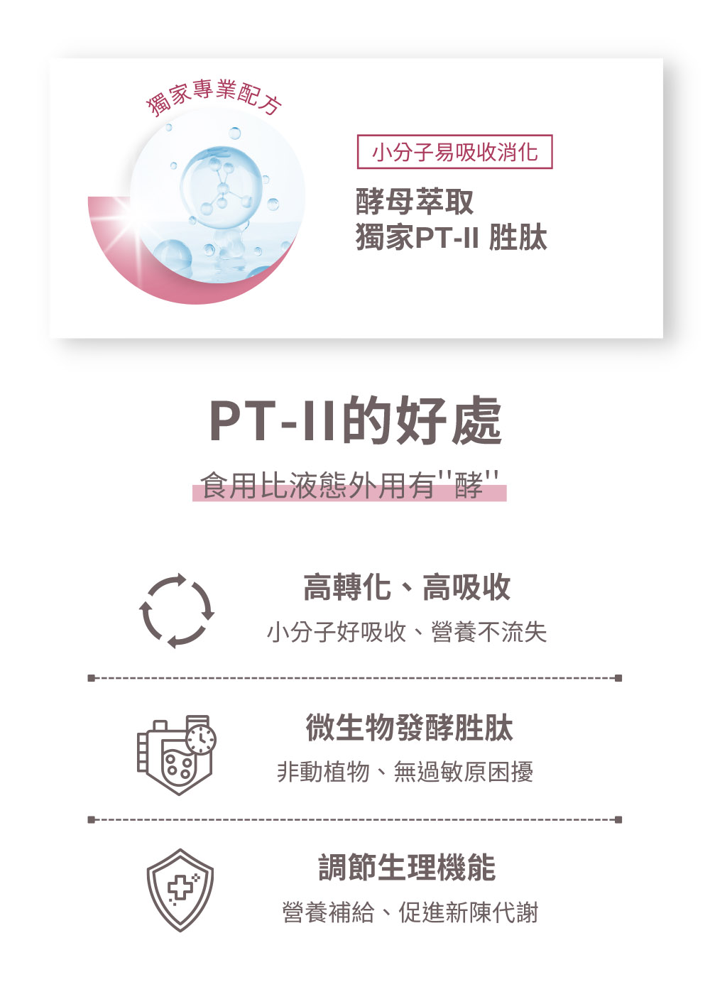 2. 成份:專利水溶性膳食纖維、葡萄皮萃取物、綜合維生素礦物質、納豆激酶、大豆胜肽、乳清蛋白、山藥萃取物、黃金蕎麥粉、紅麴粉、酵母發酵複合物(含由胺基酸、核酸發酵而得之定序元肽素、鈣肽素)。