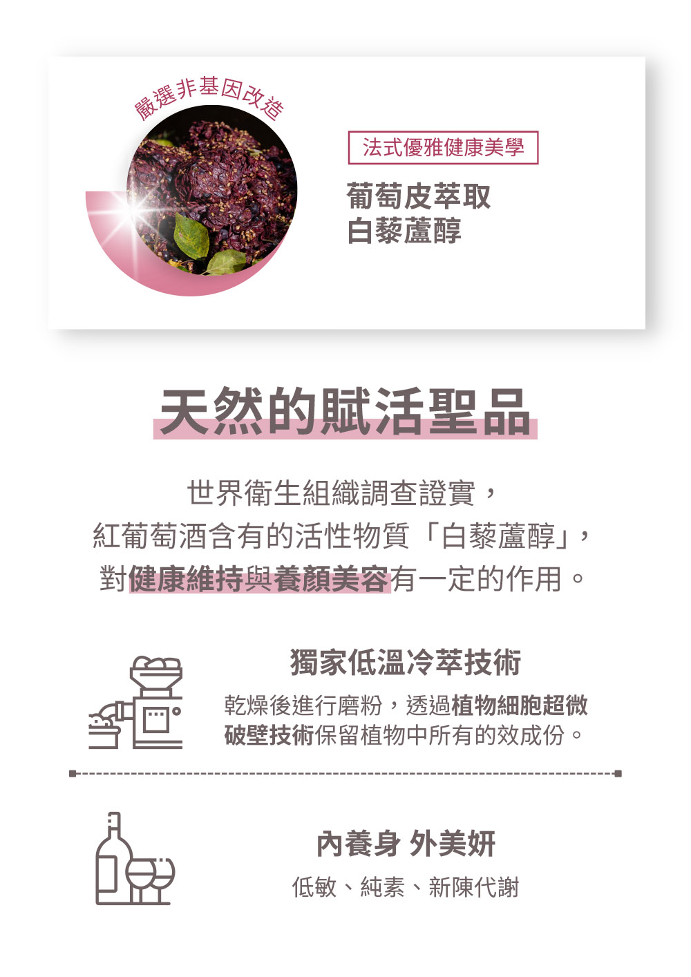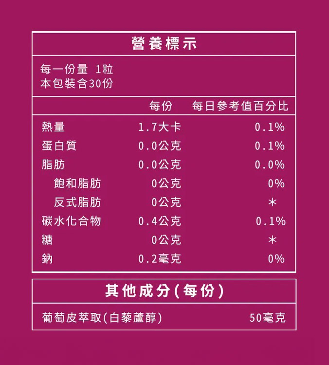 足量│每顆含50mg葡萄皮萃取物(含白藜蘆醇)