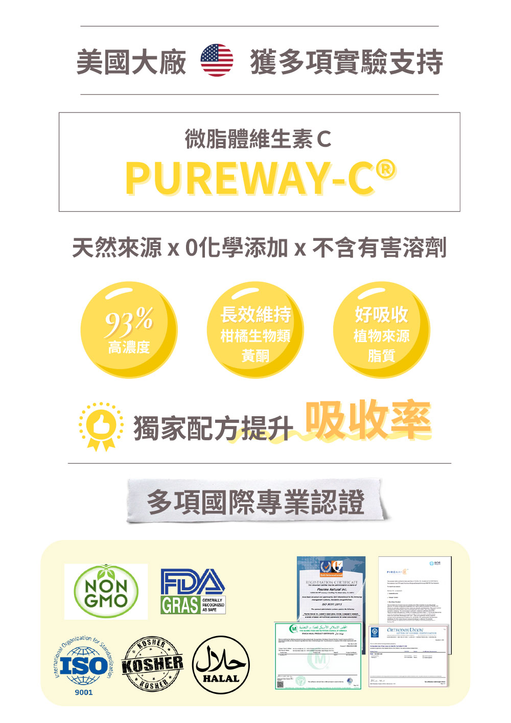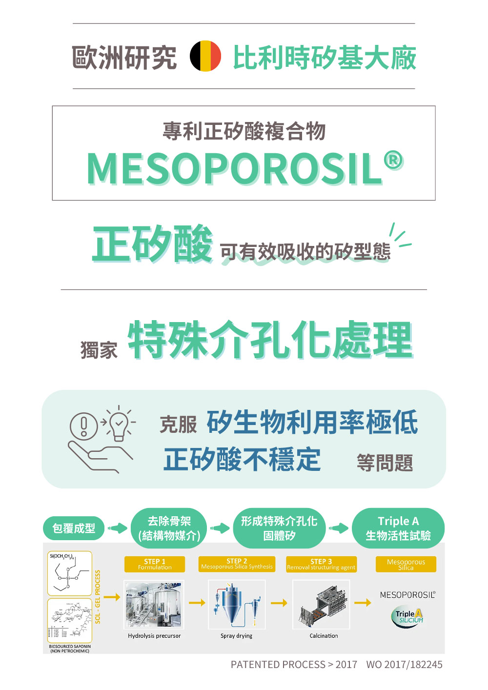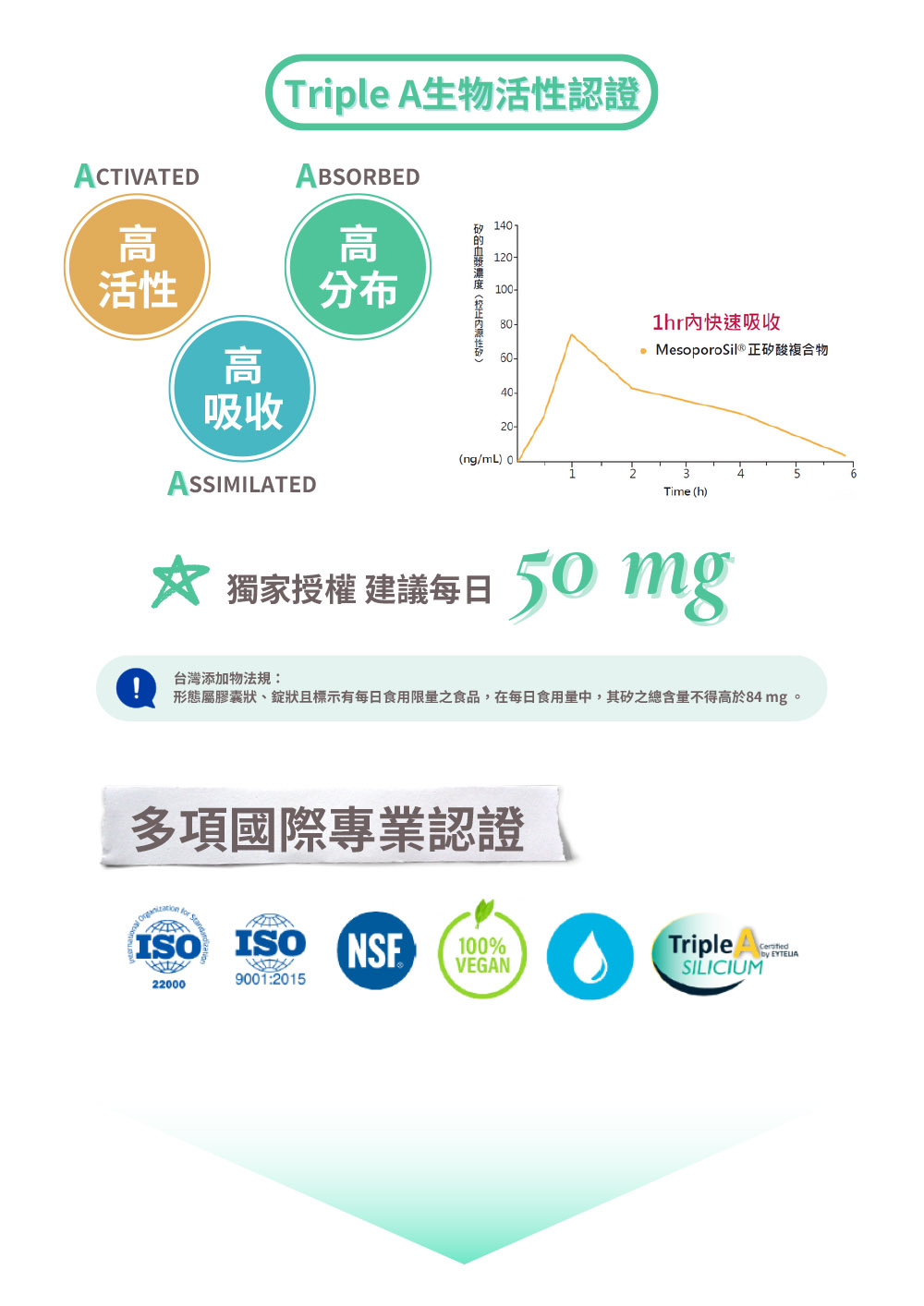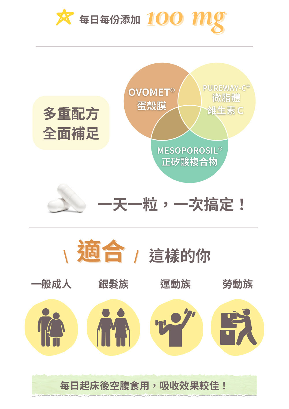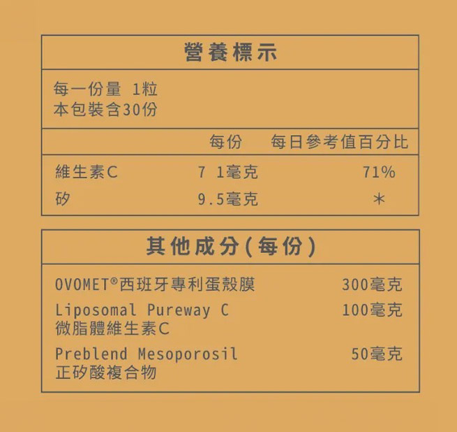 2. 成份:Ovomet® 蛋殼膜、Liposomal Pureway微脂體維生素C (維生素C、向日葵卵磷脂、米糠粉、柑橘萃取物)、MESOPOROSIL® 正矽酸複合物 (醋酸鈣、二氧化矽、微晶狀α-纖維素、羥丙基纖維素)、二氧化矽、硬脂酸鎂。