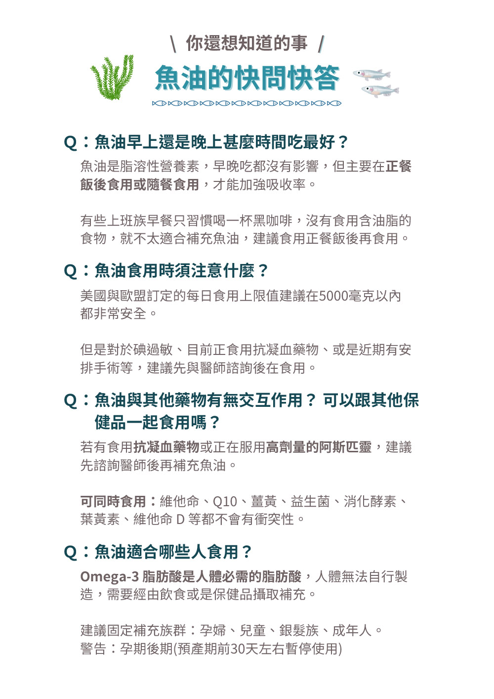 1. 魚油是油脂類,有助於脂溶性維生素的吸收,建議飯後食用。