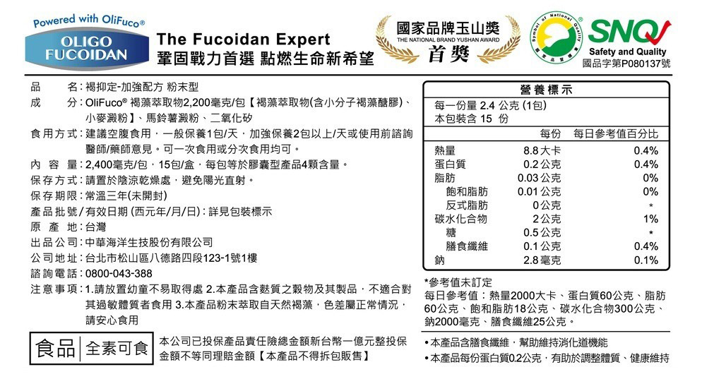 3. 成分:OliFuco®褐藻萃取物2,200毫克/包【褐藻萃取物(含小分子褐藻醣膠)、小麥澱粉】、馬鈴薯澱粉、二氧化矽
