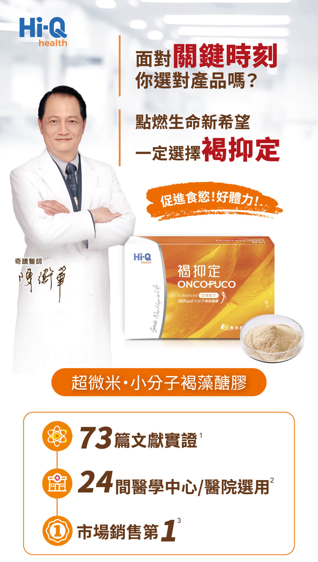 「海洋至寶」Olifuco小分子褐藻醣膠,源自深海-幫助重拾活力的秘密。Hi-Q運用獨特的酵素萃取技術,精粹分子量僅500道爾頓,有別於市售的褐藻醣膠多為30000道爾頓的大分子結構,可有效提升吸收率,補元氣,健康更有感。