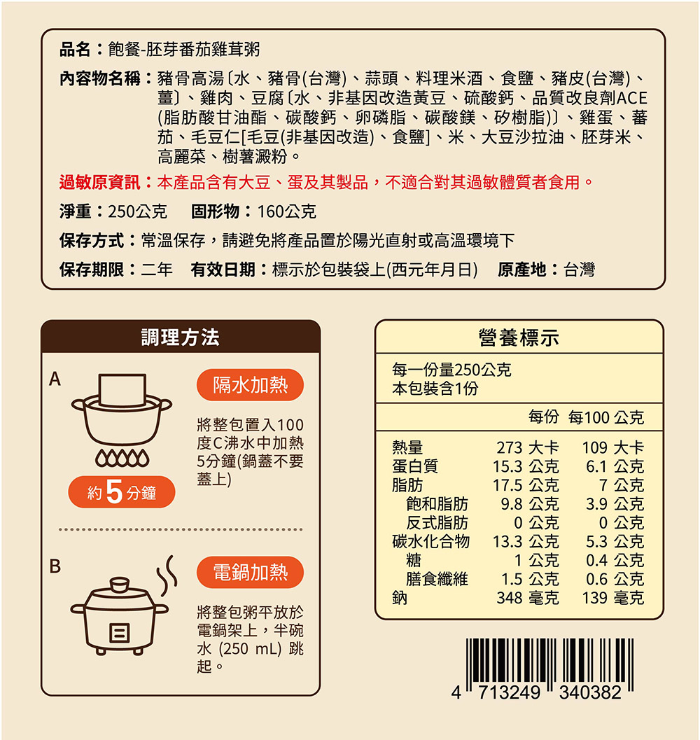 4. 過敏原:本產品含有大豆、蛋及其製品,不適合對其過敏體質者食用