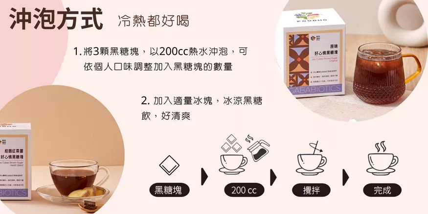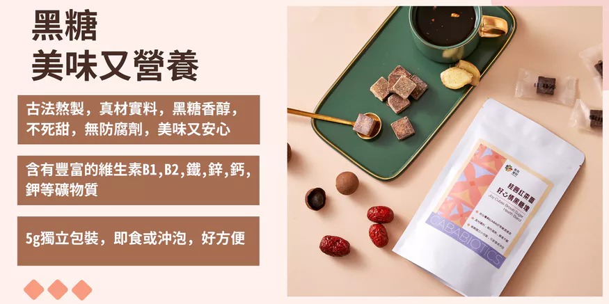 黑糖以古法製作,選用台灣在地甘蔗、真材實料,以天然食材熬煮,桂圓紅棗,桂圓含有鐵質、蛋白質;紅棗含有鐵質、蛋白質和維生素C。