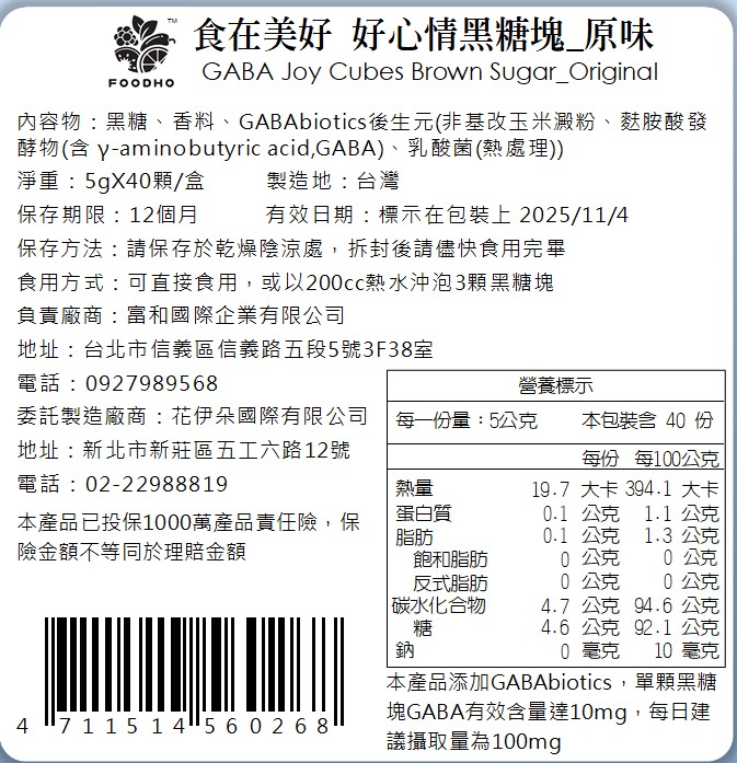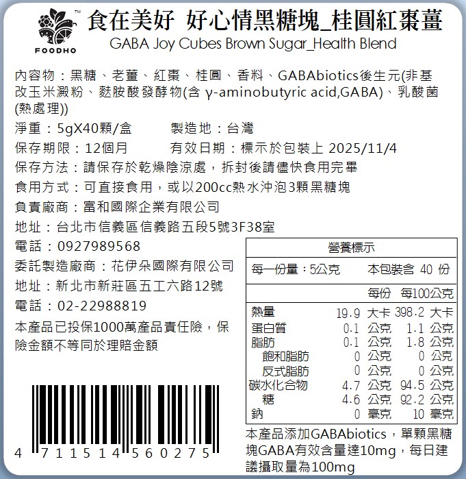 黑糖、香料、GABAbiotics後生元(非基改玉米澱粉、麩胺酸發酵物(含 γ-aminobutyric acid,GABA)、乳酸菌(熱處理))